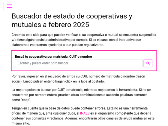 Suspended Cooperatives is a site that allows you to check if your cooperative or mutual is suspended and/or has any administrative requirements to be fulfilled. If this is the case, we have a set of instructions which we hope will help you to regularize your situation.